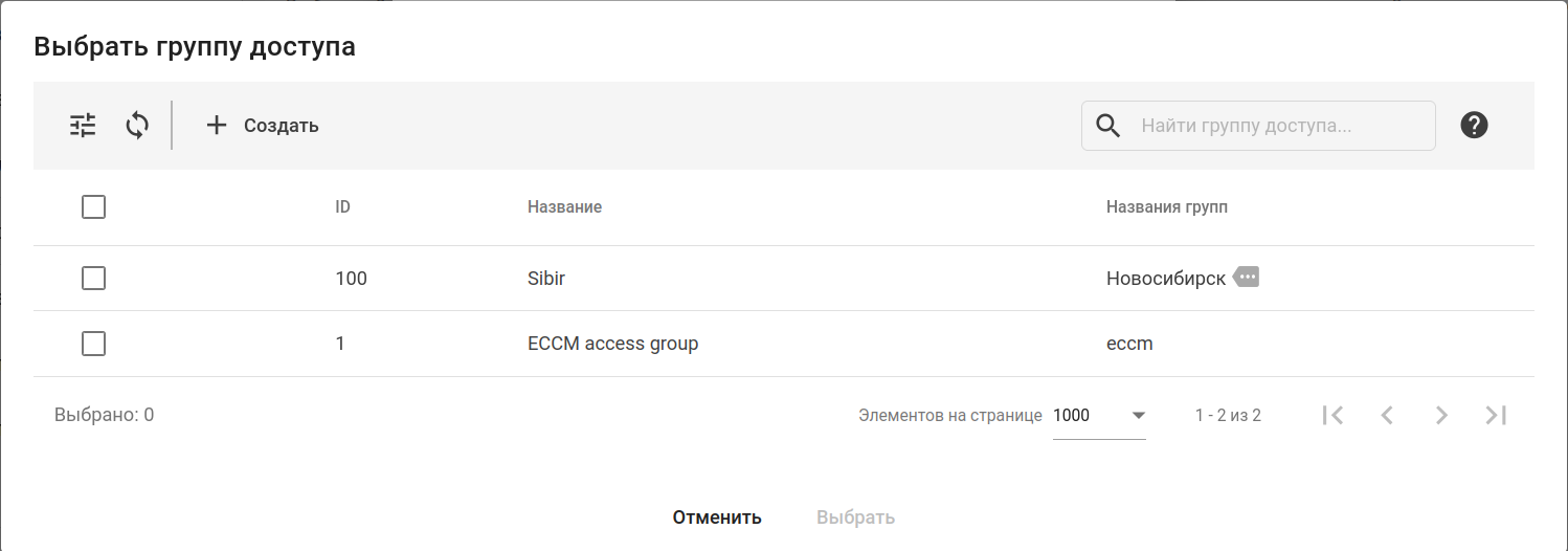 Чтобы добавить группу доступа пользователю, в таблице с помощью флагов выберите одну или несколько групп доступа и нажмите кнопку "Выбрать".