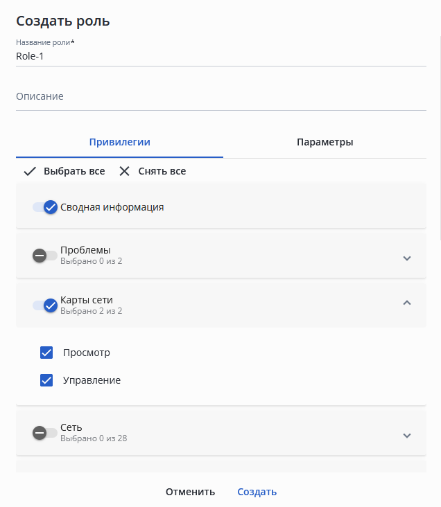 Если в роль включена привилегия "Просмотр" со страницы "Карты сети", но не включена привилегия "Управление", то пользователь сможет просматривать созданные ранее карты сети на странице "Карты сети", но не сможет создать свою карту и вносить изменения в существующую. - Переключатель напротив каждой группы привилегий — позволяет включать или выключать все привилегии, относящиеся к конкретной странице web-интерфейса.