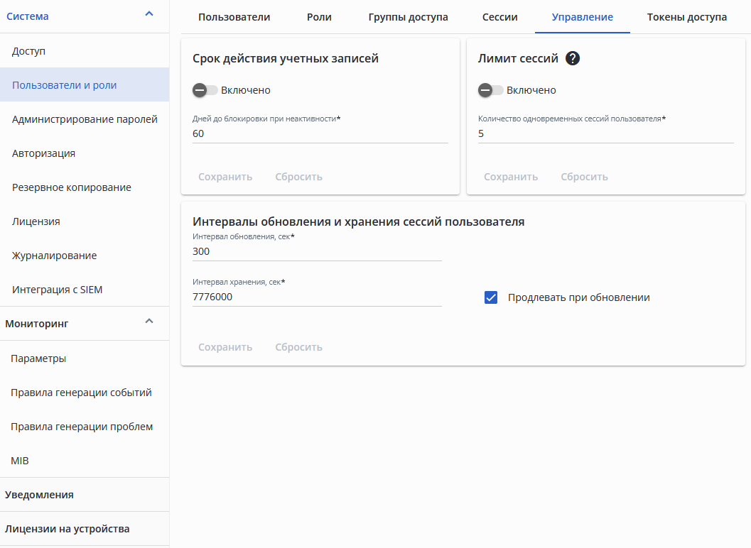 - Продлевать при обновлении — включает продление длительности сессии (интервала хранения) при совершении пользователем действий в системе (т. е. обновлении токена доступа пользователя);