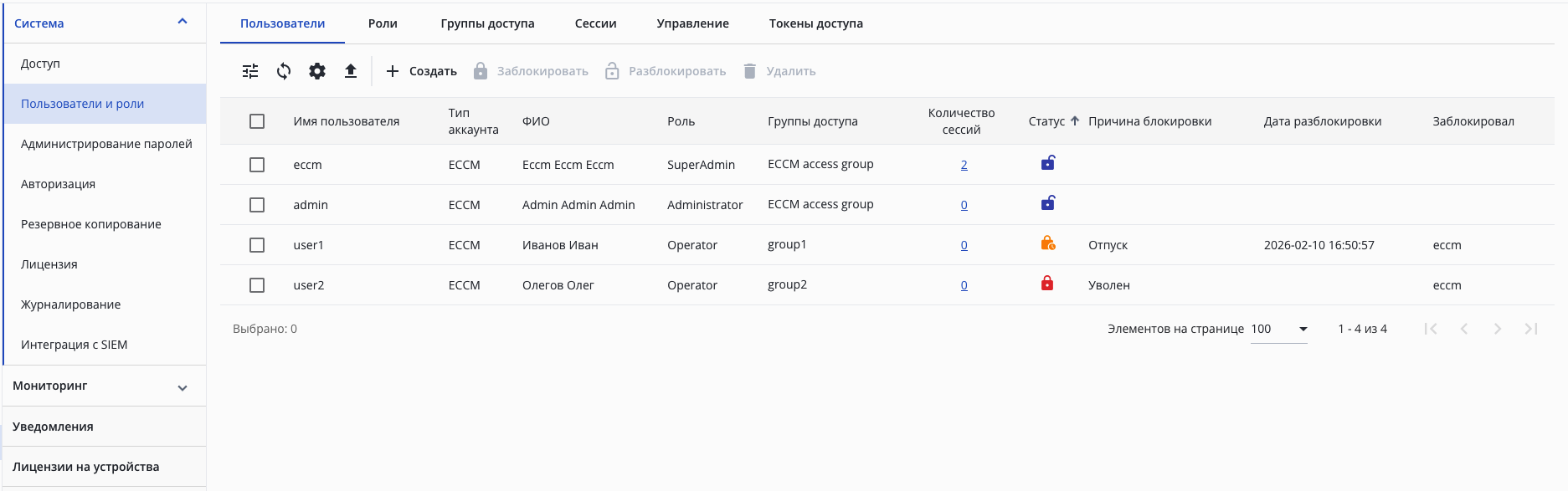 - SuperAdmin — роль для управления системой ECCM. Привилегии: управление пользователями, ролями. Управление глобальными настройками доступа к устройствам. Также доступны все возможности, предоставленные другим ролям;