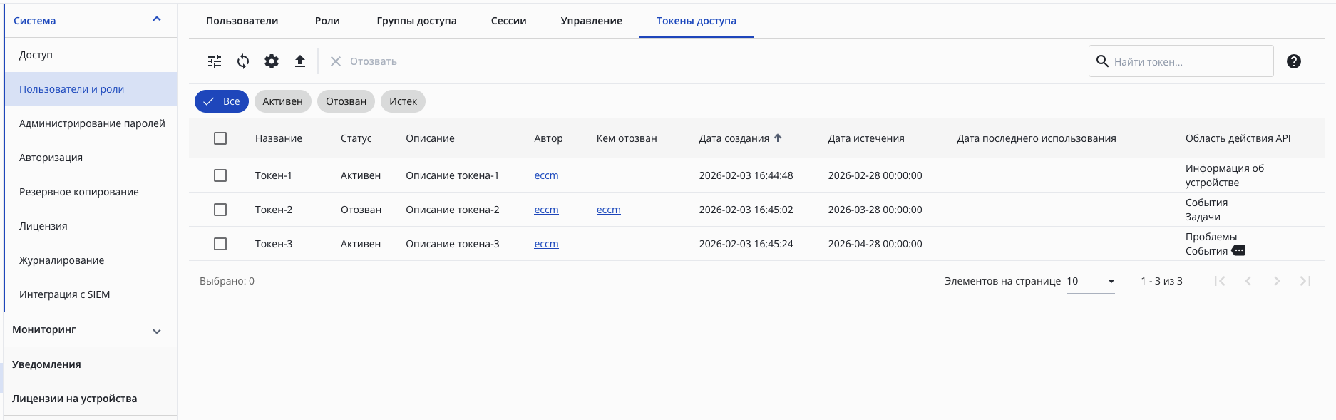 Вкладка содержит интерфейс для управления токенами доступа всех пользователей системы:
