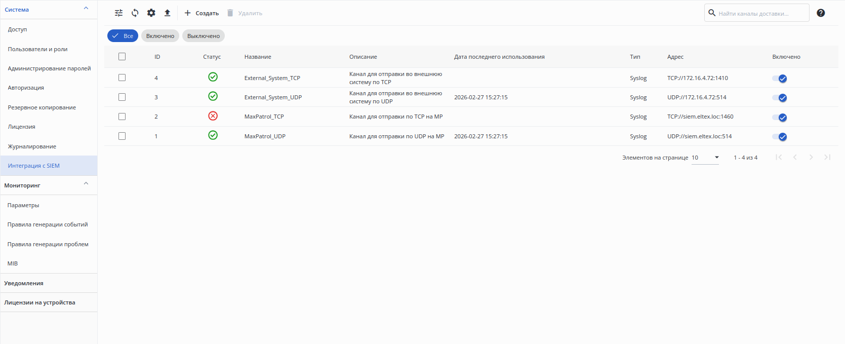 Раздел предназначен для создания и управления каналами доставки, отправляющими события и проблемы во внешнюю систему мониторинга (SIEM). При наличии каналов доставки система производит проверку соответствия каждого события и проблемы установленным фильтрам. Если событие или проблема соответствует фильтрам, канал доставки отправляет данные в SIEM. Подробная информация о настройке формирования событий и проблем находится в соответствующих разделах "Правила генерации событий" и "Правила генерации проблем".