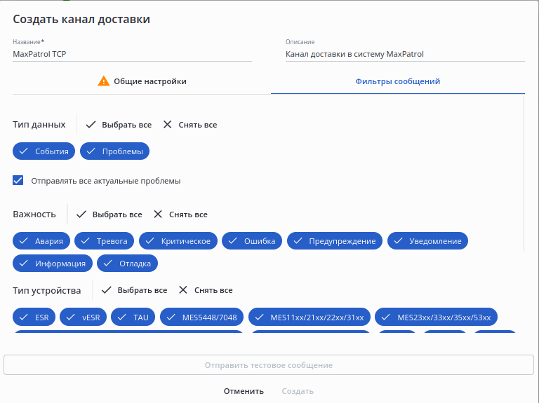 • Фильтры сообщений — параметры для фильтрации событий и проблем из ECCM при отправке во внешнюю систему.