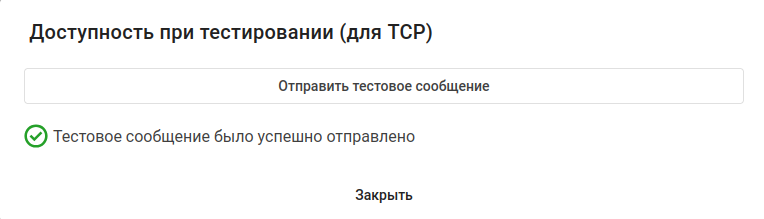 При нажатии на кнопку "Отправить тестовое сообщение" отображается диалоговое окно "Доступность при тестировании (для {протокол})" со статусом отправленного сообщения.
