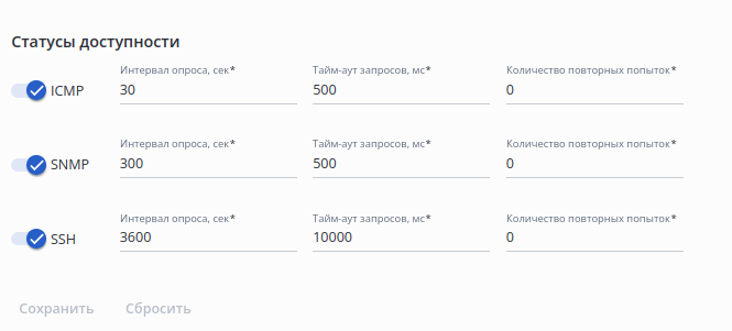 • Переключатель для включения/выключения опроса статусов доступности устройств по конкретному протоколу (ICMP, SNMP, SSH);