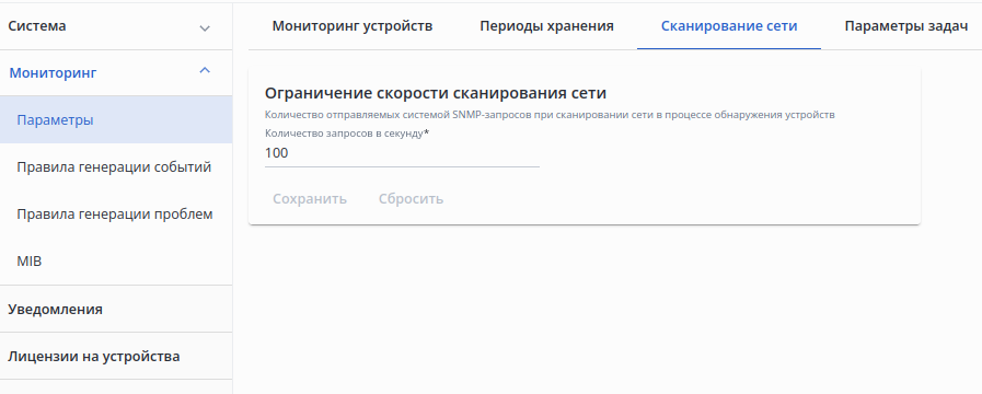 • Количество запросов в секунду — количество отправляемых системой SNMP-запросов при сканировании сети в процессе обнаружения устройств;
