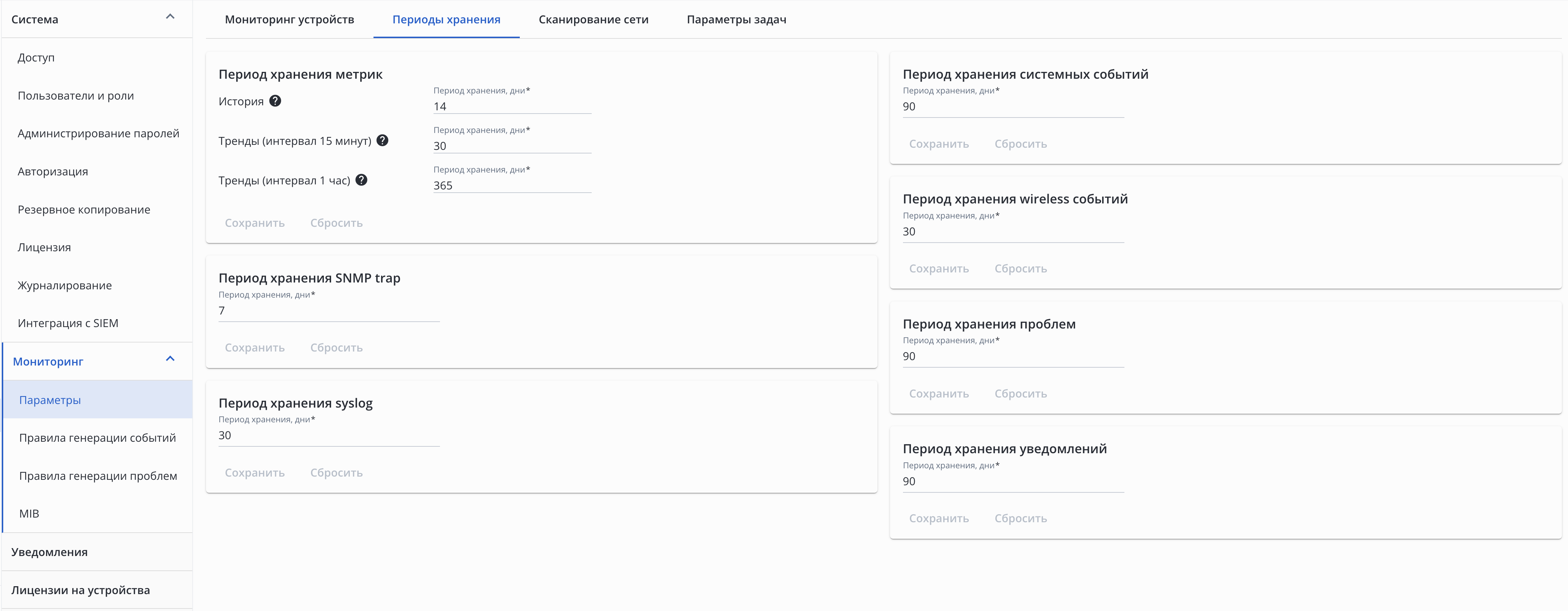 • Кнопка "Сохранить" — кнопка для применения настроек периода хранения метрик устройств;