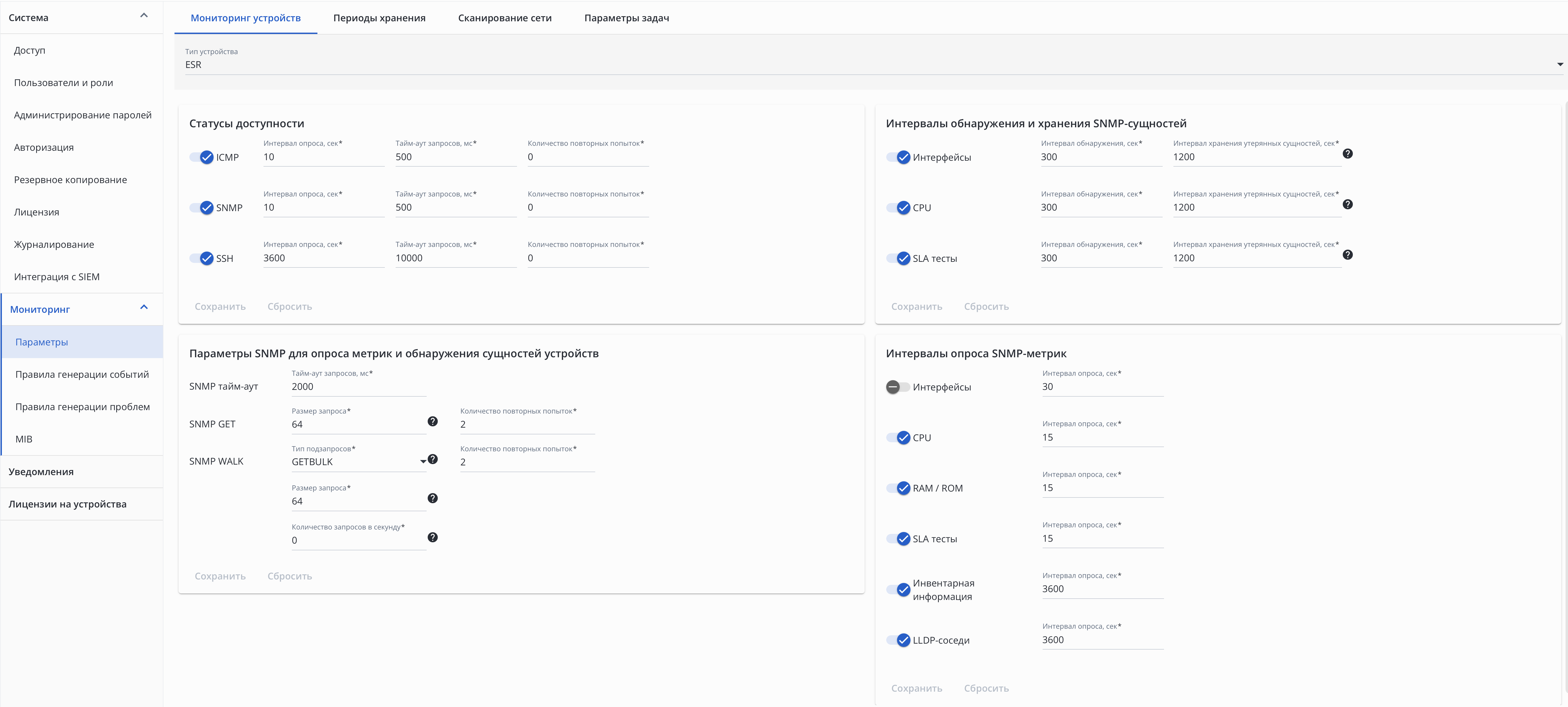 Раздел предназначен для настройки мониторинга системы: проверки статусов доступности устройств по протоколам ICMP, SNMP и SSH, настройки интервала сбора метрик, обнаружения и хранения сущностей, настройки периода хранения системных уведомлений, а также метрик/SNMP trap/Syslog-сообщений/задач/событий/проблем устройств, настройки интервала получения конфигурации и ПО устройств.