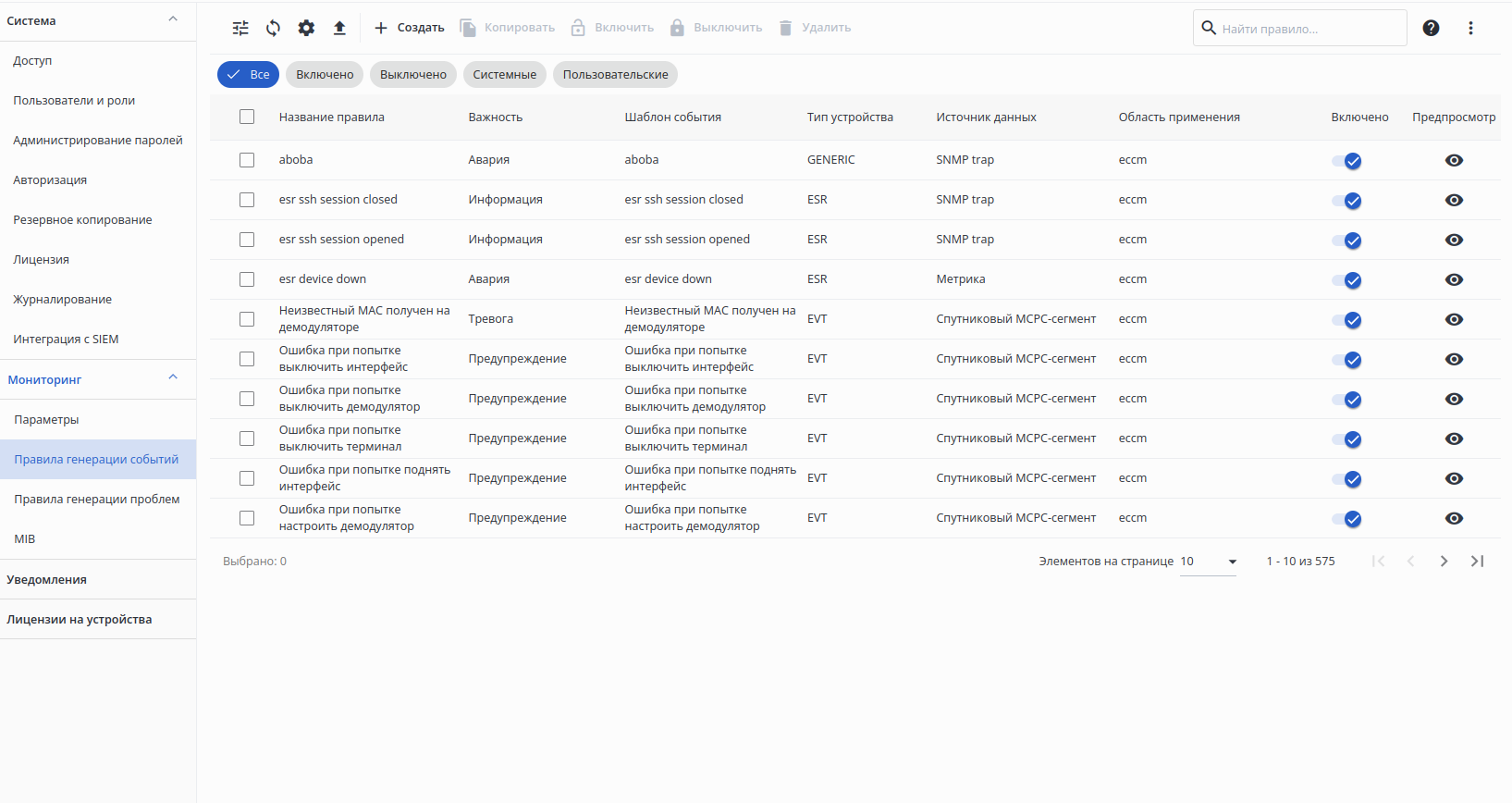 Для включения или выключения группы правил генерации событий выделите правила в таблице и нажмите кнопку "Включить" или "Выключить" соответственно.