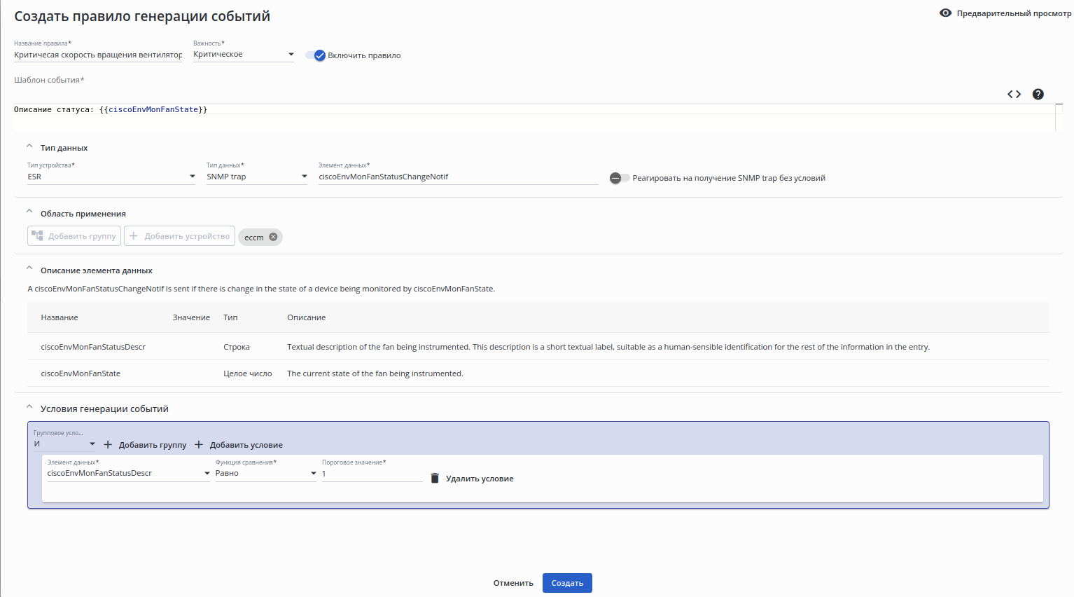 • Включено — переключатель включения/выключения правила генерации событий;