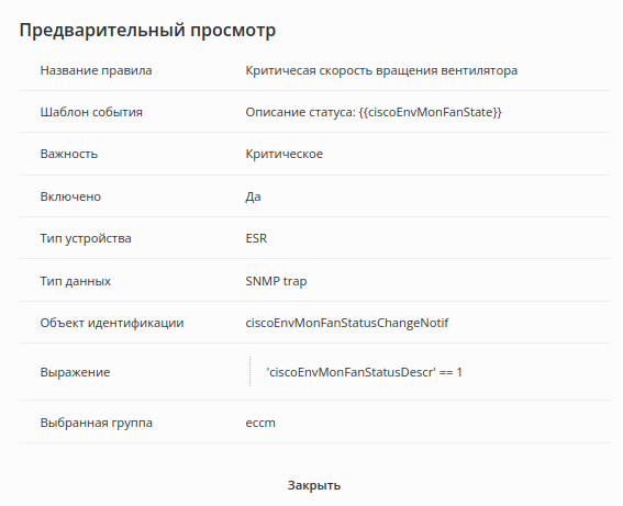 Для предварительного просмотра создаваемого правила нажмите на кнопку "Предварительный просмотр", расположенную в правом верхнем углу окна "Создать правило генерации событий". Параметры создаваемого правила будут отображены в окне "Предварительный просмотр". Для закрытия окна нажмите кнопку "Закрыть".