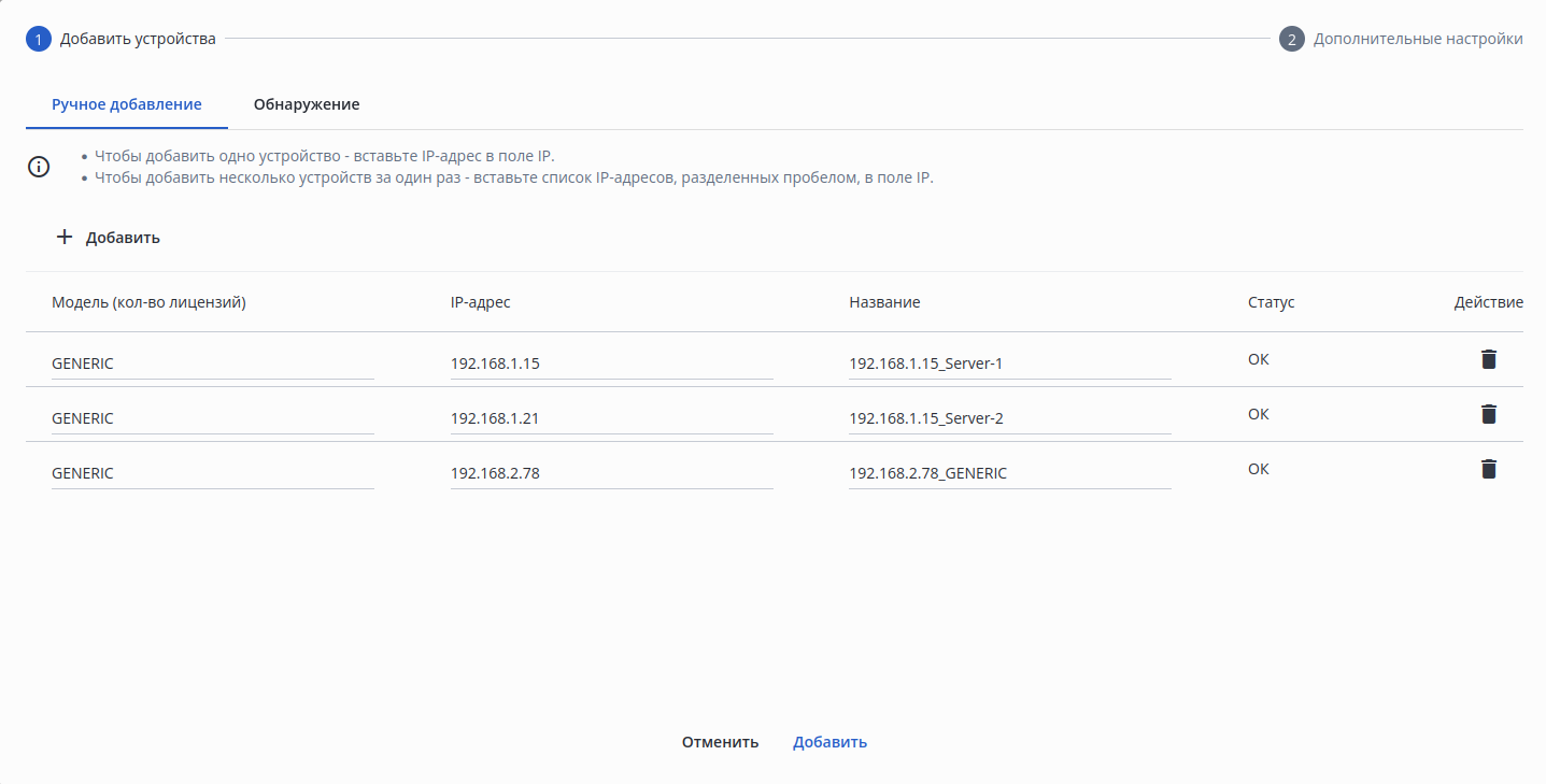 Способ 1. В окне добавления устройств во вкладке «Ручное добавление» выберите модель «GENERIC», введите IP-адрес устройства и, при необходимости, измените название устройства, с которым оно будет отображаться в системе. Нажмите кнопку «Добавить», расположенную в нижней части окна.