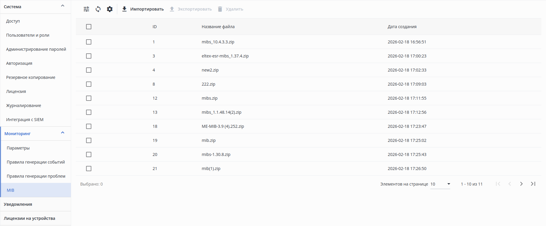 Загруженные MIB-архивы будут отображены в таблице архивов: