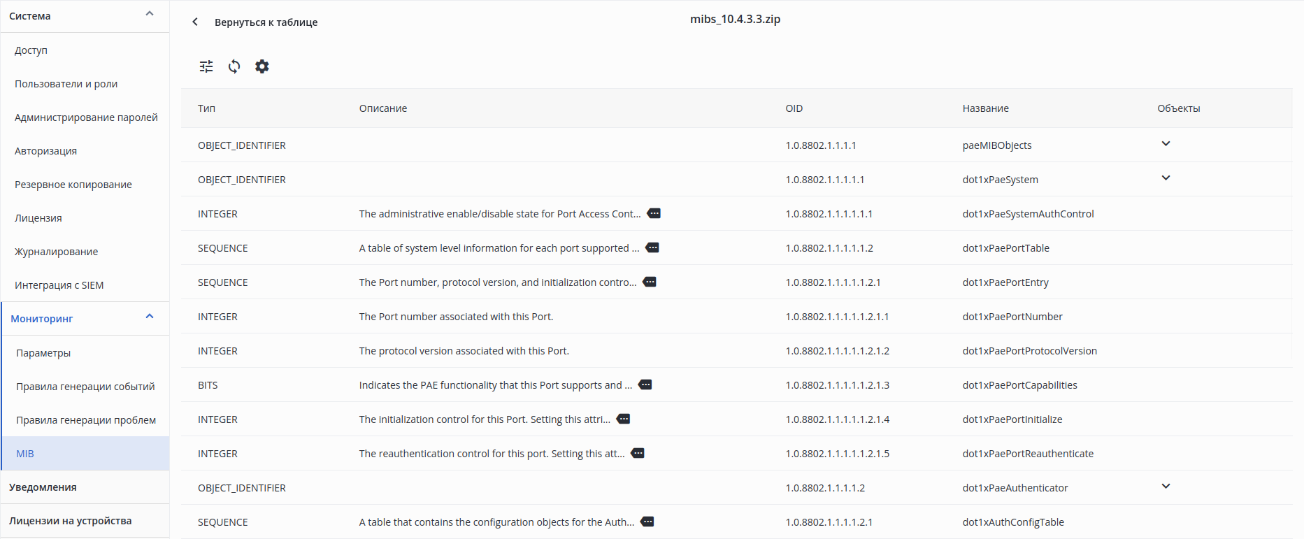 При нажатии на строку с архивом откроется его содержимое — загруженные MIB-объекты: