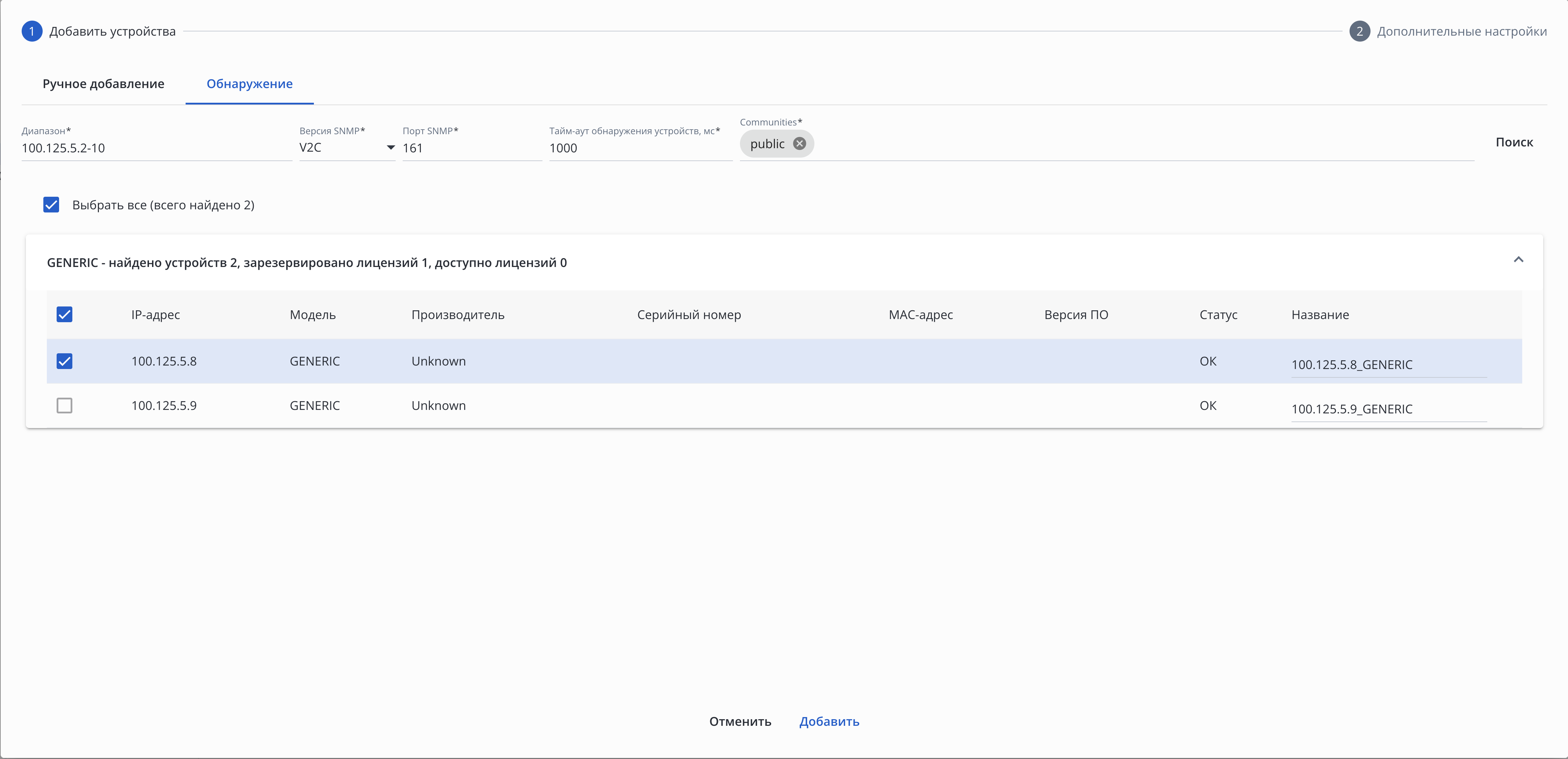 Способ 2. В окне добавления устройств во вкладке «Обнаружение» можно найти включенные в сеть GENERIC-устройства по протоколу SNMP. Для этого укажите диапазон поиска и нажмите кнопку «Поиск». Выберите из списка найденных устройств те, которые необходимо добавить в систему, измените их название (если необходимо) и нажмите кнопку «Добавить».