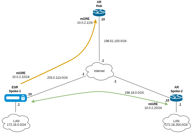 Установить сетевую связность между LAN-подсетями, расположенными за Spoke-устройствами.В данном примере устройство модели ESR выступает в роли Spoke-1, а AR - в роли Spoke-2 и Hub. Каждый из Spoke будет анонсировать свою LAN-сеть Hub-устройству. Hub анонсирует каждому Spoke маршрут по умолчанию.