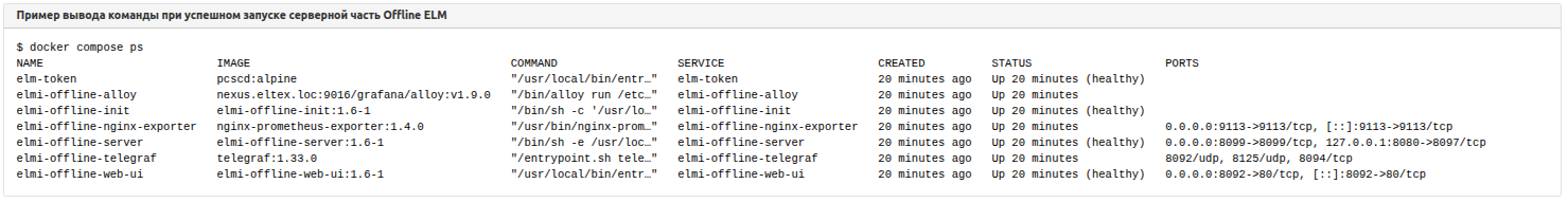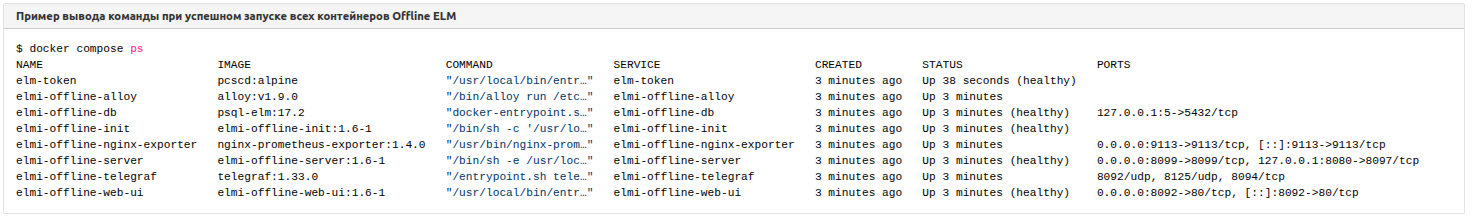 3. После запуска убедитесь, что все контейнеры Offline ELM запустились корректно (имеют статус "healthy"). Запуск может занять до 3х минут.