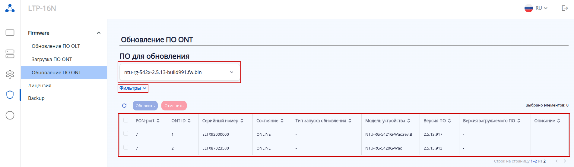 На данной странице присутствует выпадающее меню с выбором необходимой версии, на которую будет осуществляться обновление ONT, фильтры отображения и список активных ONT, которые могут быть обновлены. - Для выполнения обновления необходимо выбрать версию ПО, на которую будет выполняться обновление, а затем отметить ONT, подлежащие обновлению, установив соответствующую пометку . Может быть отмечен как один ONT, так и группа ONT. После этого следует нажать кнопку запуска обновления .