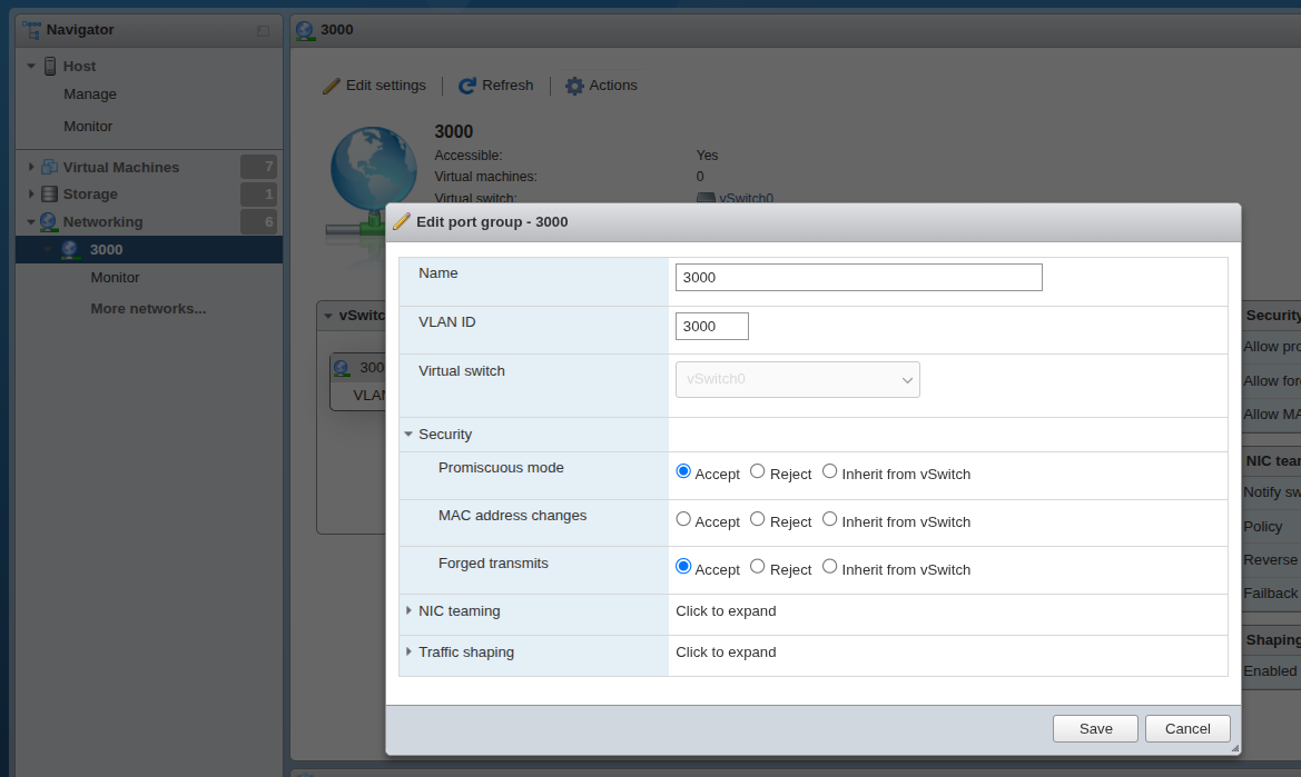 Для включения Promiscuous mode необходимо перейти в меню "Networking" выберите необходимый сетевой адаптер, нажмите на кнопку "Edit settings", разверните раздел "Security", устнановите параметр "Promiscuous mode" и "Forged transmits" на "Accept"