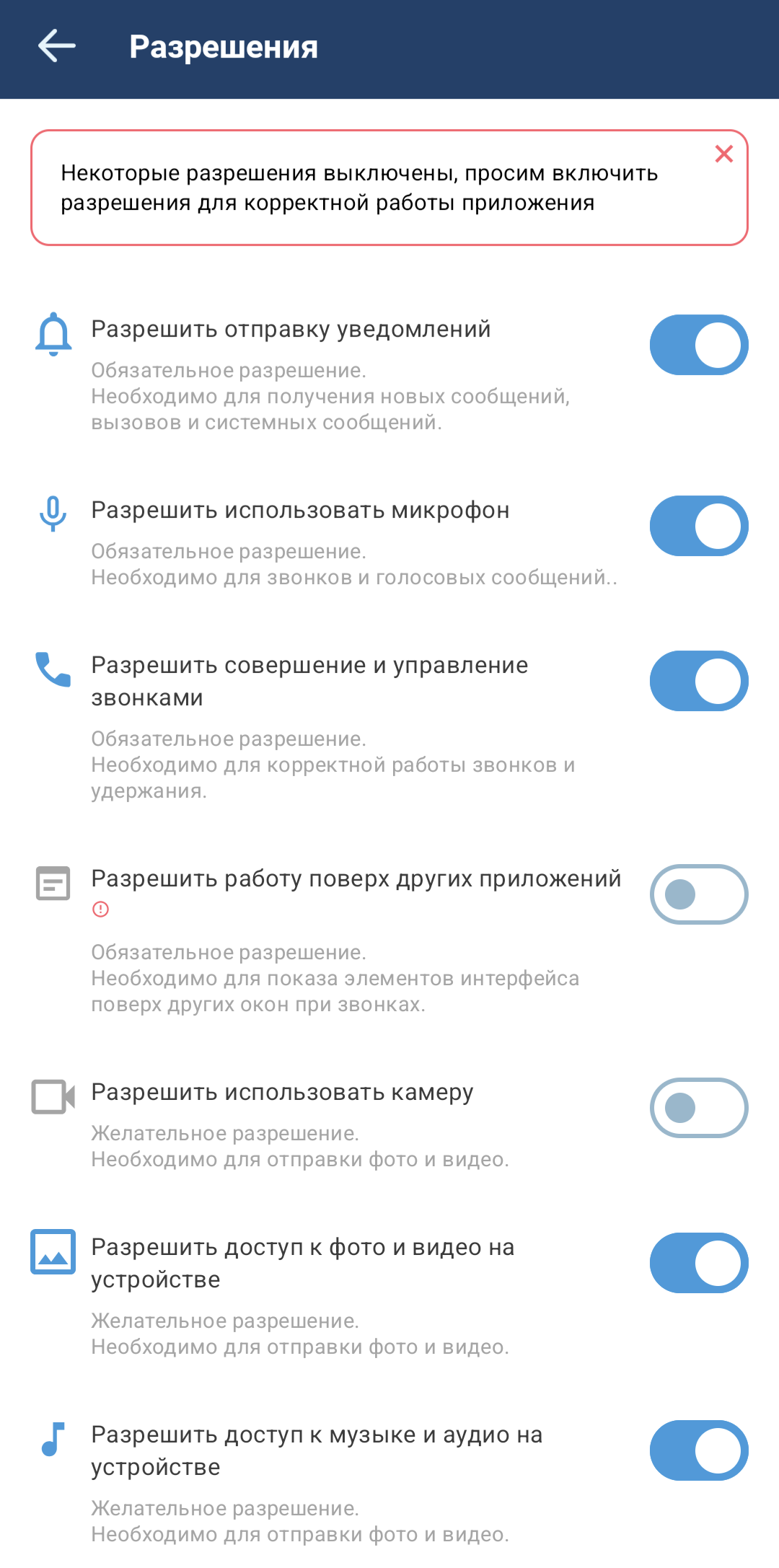 Экран «Разрешения» содержит список разрешений, обязательных или желательных для работы приложения.