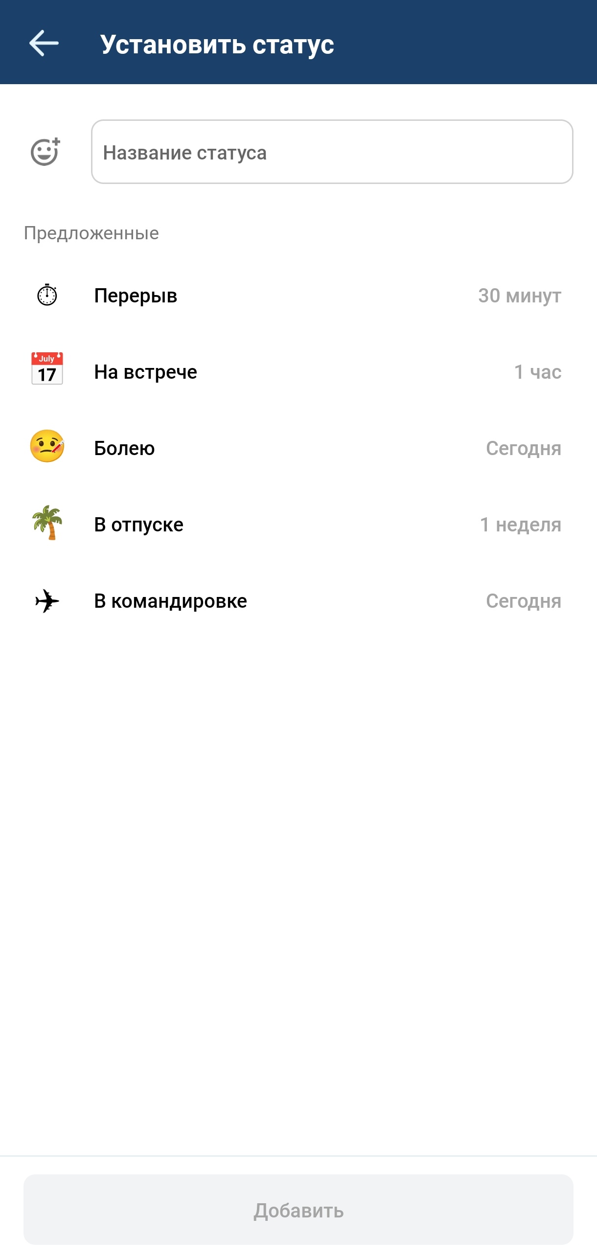 Экран настройки статусов содержит список возможных дополнительных статусов. При выборе одного из статусов можно настроить его длительность. Также можно создавать свои статусы, давая им названия и выбирая эмодзи. Если не выбирать эмодзи, оно применится по умолчанию, время своего статуса по умолчанию 1 час.
