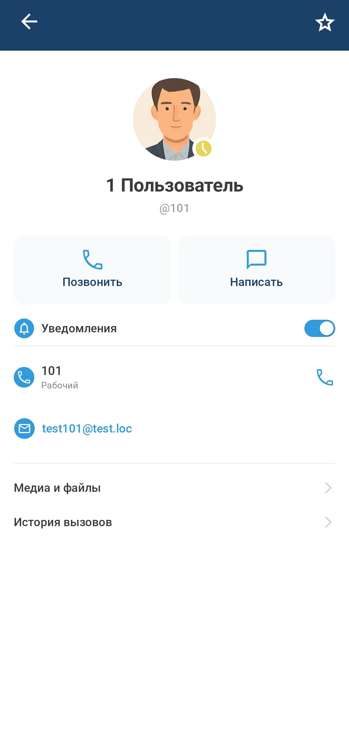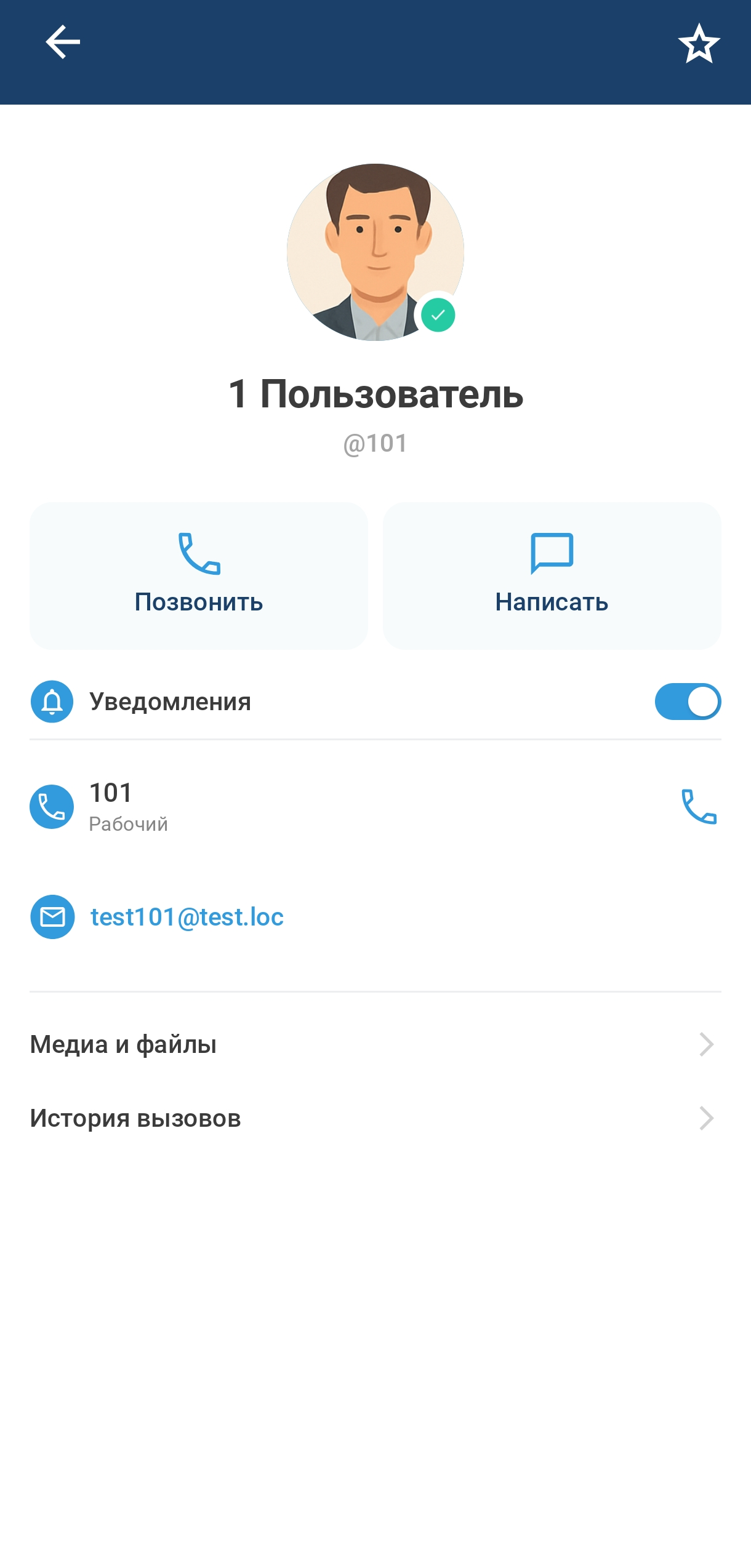 Интерфейс информации о личном чате открывает карточку контакта, которая содержит: