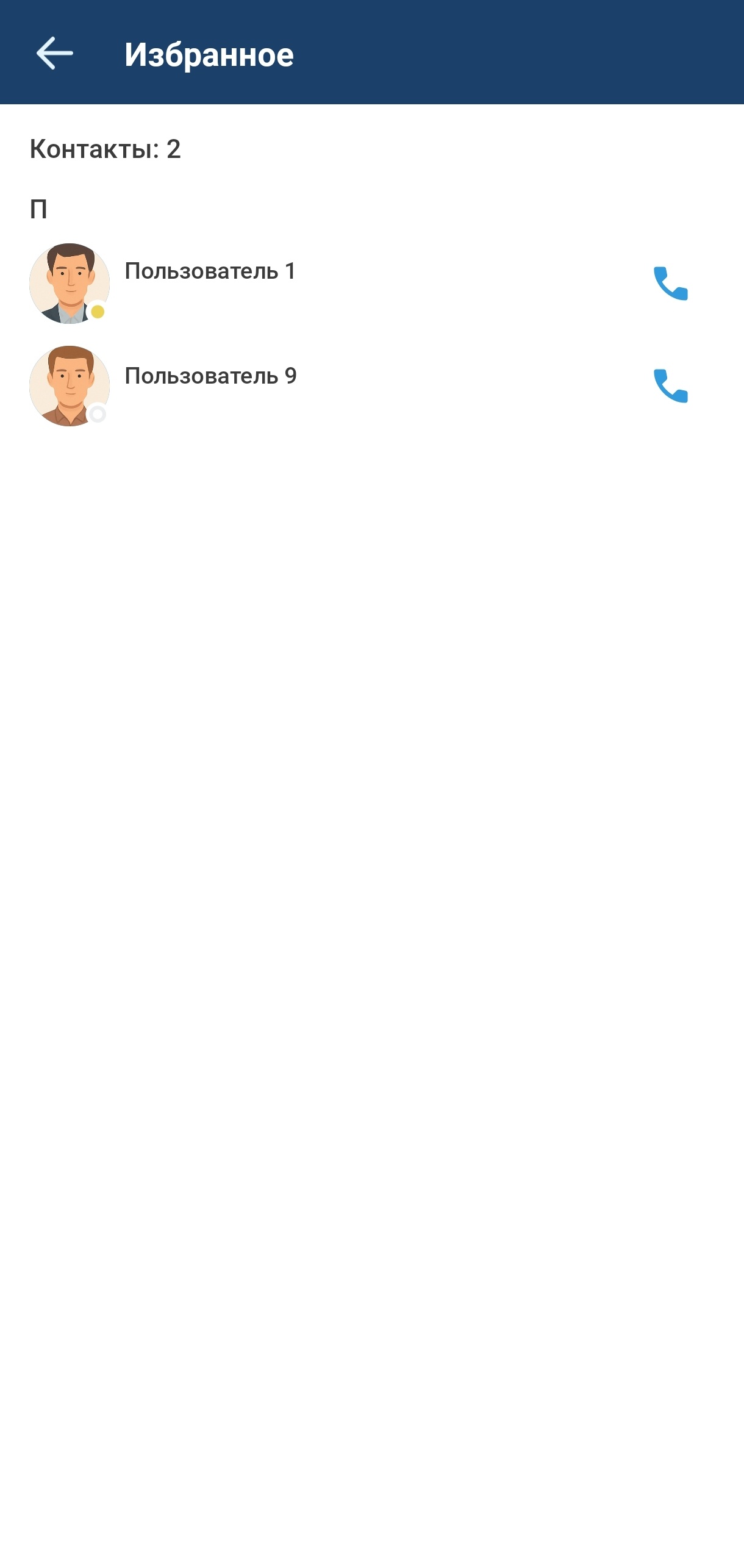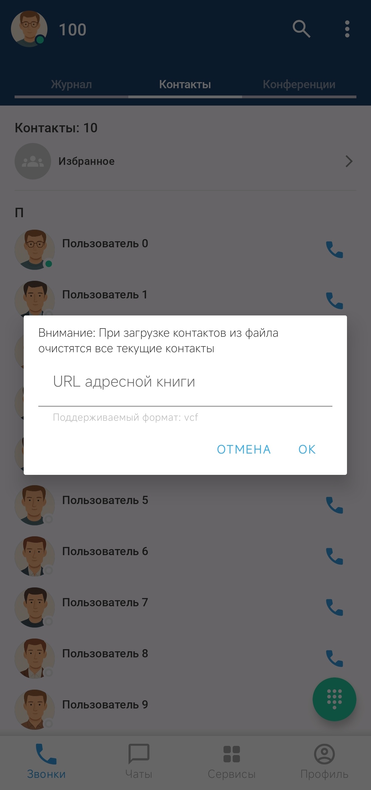 Во вкладке «Контакты» отображаются контакты из сервиса адресной книги или контакты из загруженной на устройство адресной книги.