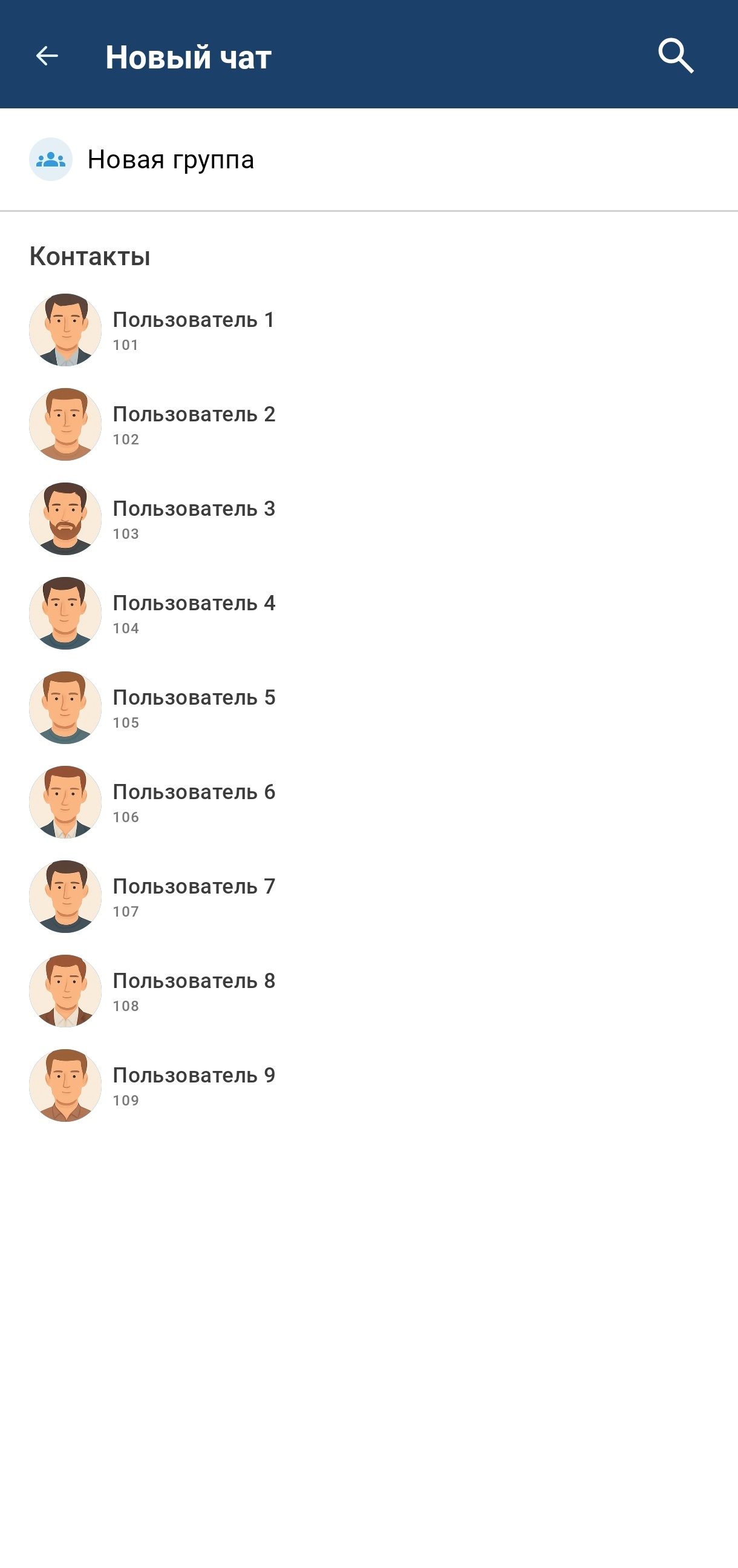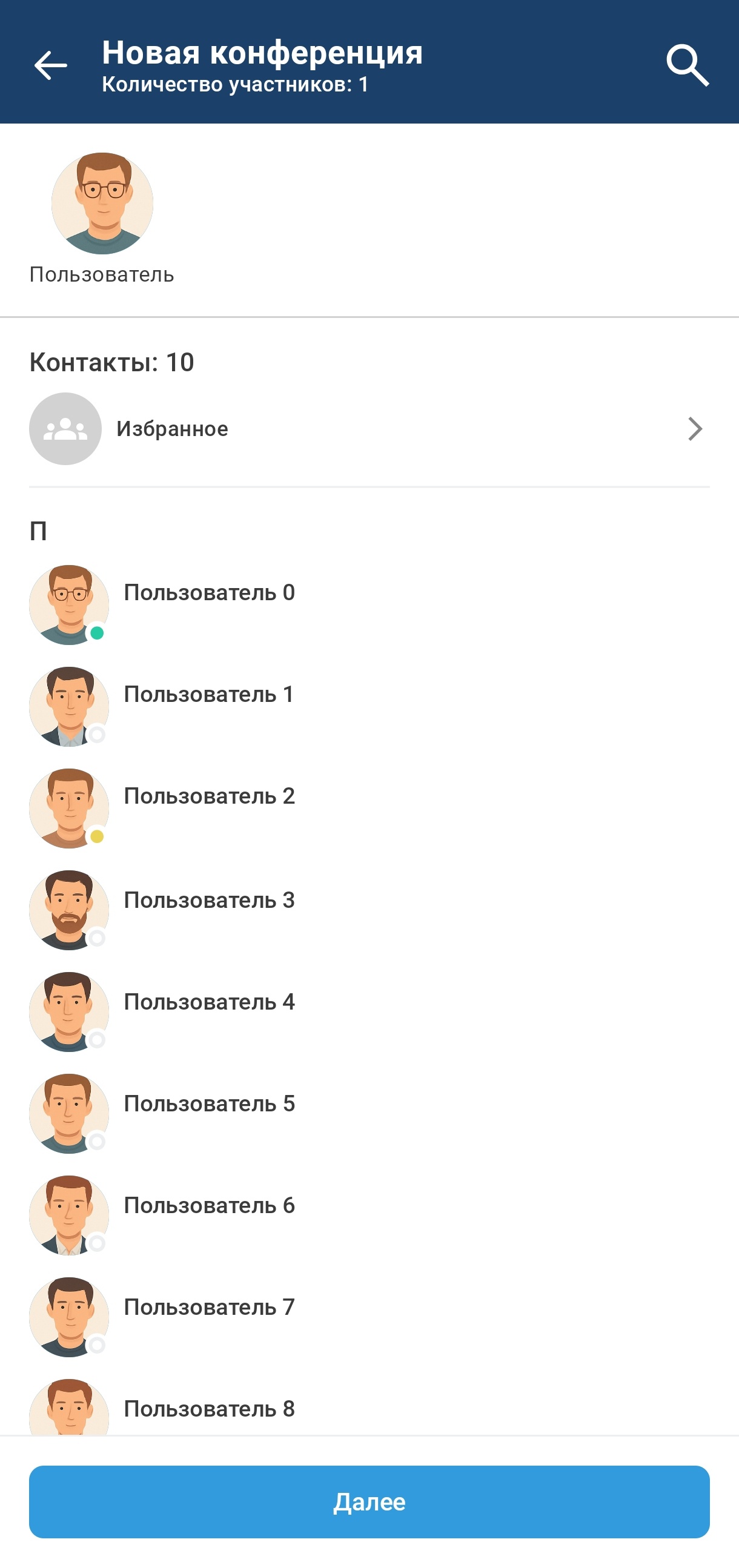 При нажатии на пользователя из списка он будет отмечен для добавления в групповой чат, а в верхней части интерфейса отобразится список всех отмеченных пользователей. При дальнейших нажатиях на других пользователей они будут отмечаться в списке и появляться в верхней части интерфейса в списке всех отмеченных. Для удаления отметки с пользователя можно повторно нажать на него в списке всех пользователей, либо нажать на него в списке отмеченных пользователей.