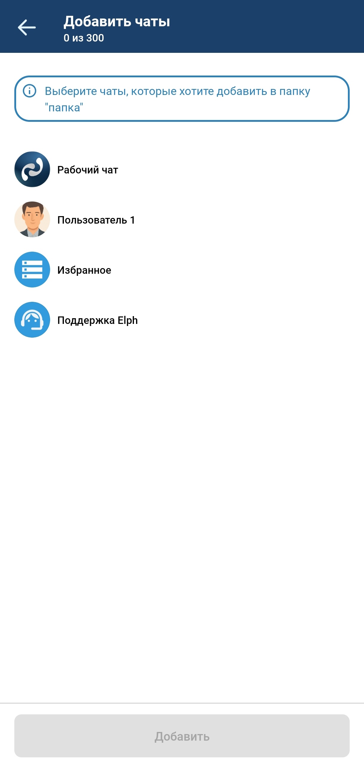 После выбора всех пользователей, которых необходимо добавить в групповой чат, необходимо нажать на кнопку Добавить для добавления выбранных пользователей в групповой чат.