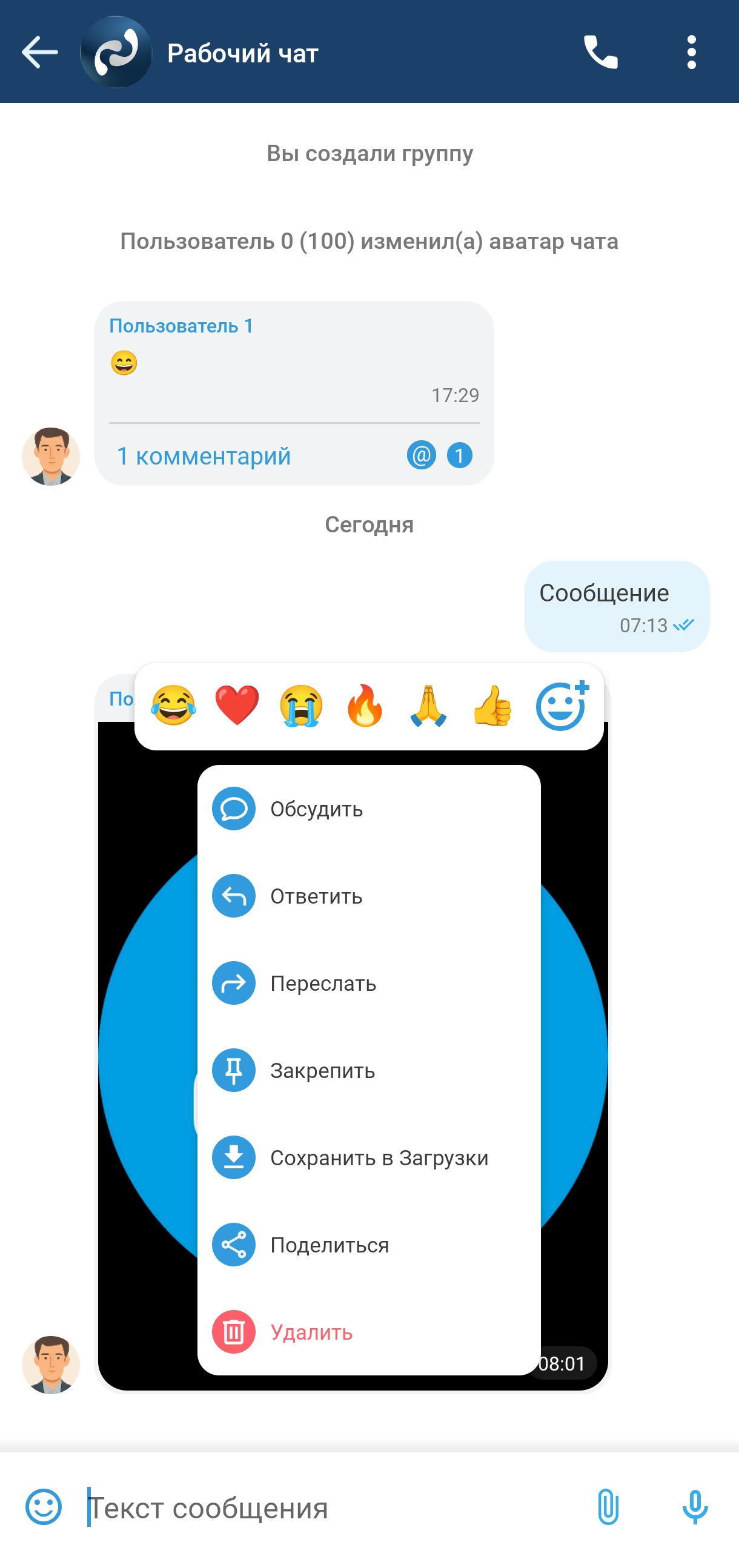 Редактирование и удаление темы доступно из контекстного меню темы на интерфейсе списка тем в суперчате, из выпадающего меню на интерфейсе темы и из интерфейса информации о чате (см. раздел «Интерфейс информации о чате»).