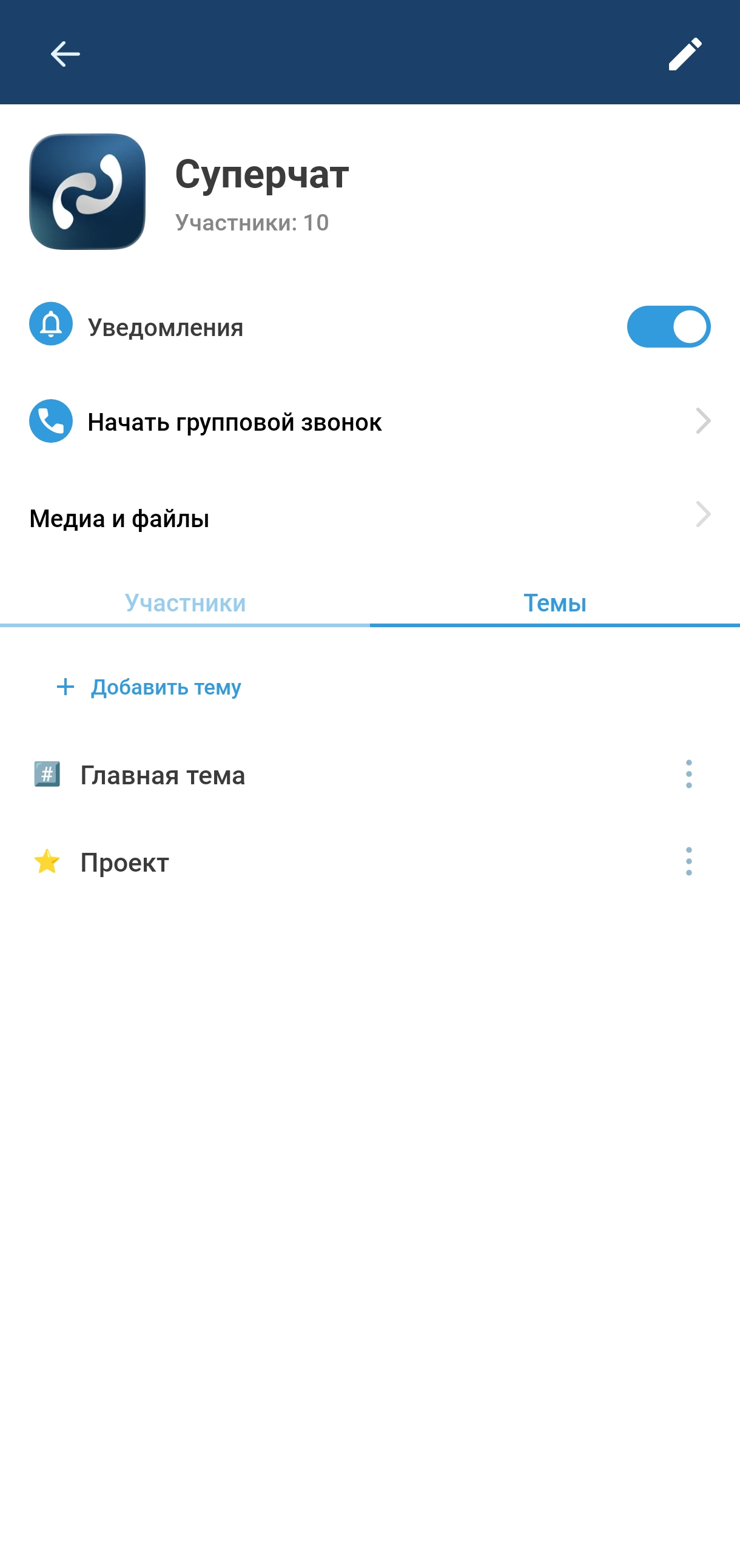 Суперчат можно создать из обычного группового чата. Чтобы конвертировать обычный групповой чат в суперчат , откройте экран редактирования группового чата (см. раздел «Интерфейс детальной информации о чате»),  активируйте переключатель «Темы» и нажмите Сохранить.