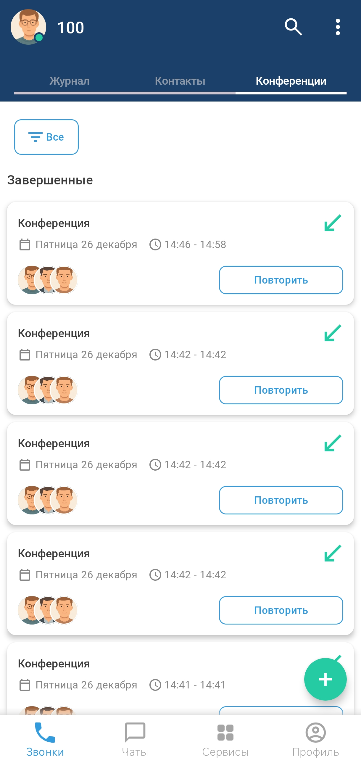 Во вкладке «Конференции» отображаются конференции, в которых пользователь был участником, включая активные на данный момент.