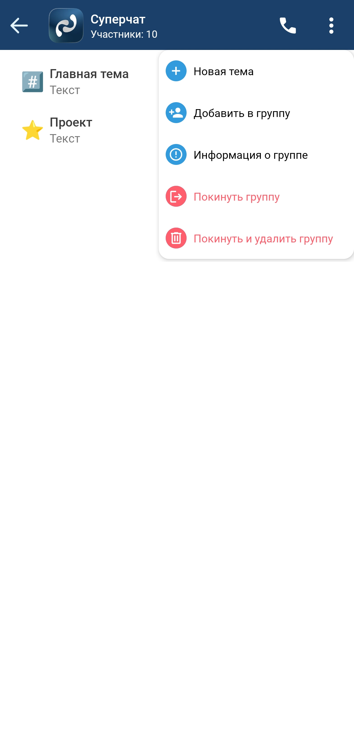 • кнопка Добавить тему (только для суперчата, см. раздел «Суперчаты»);