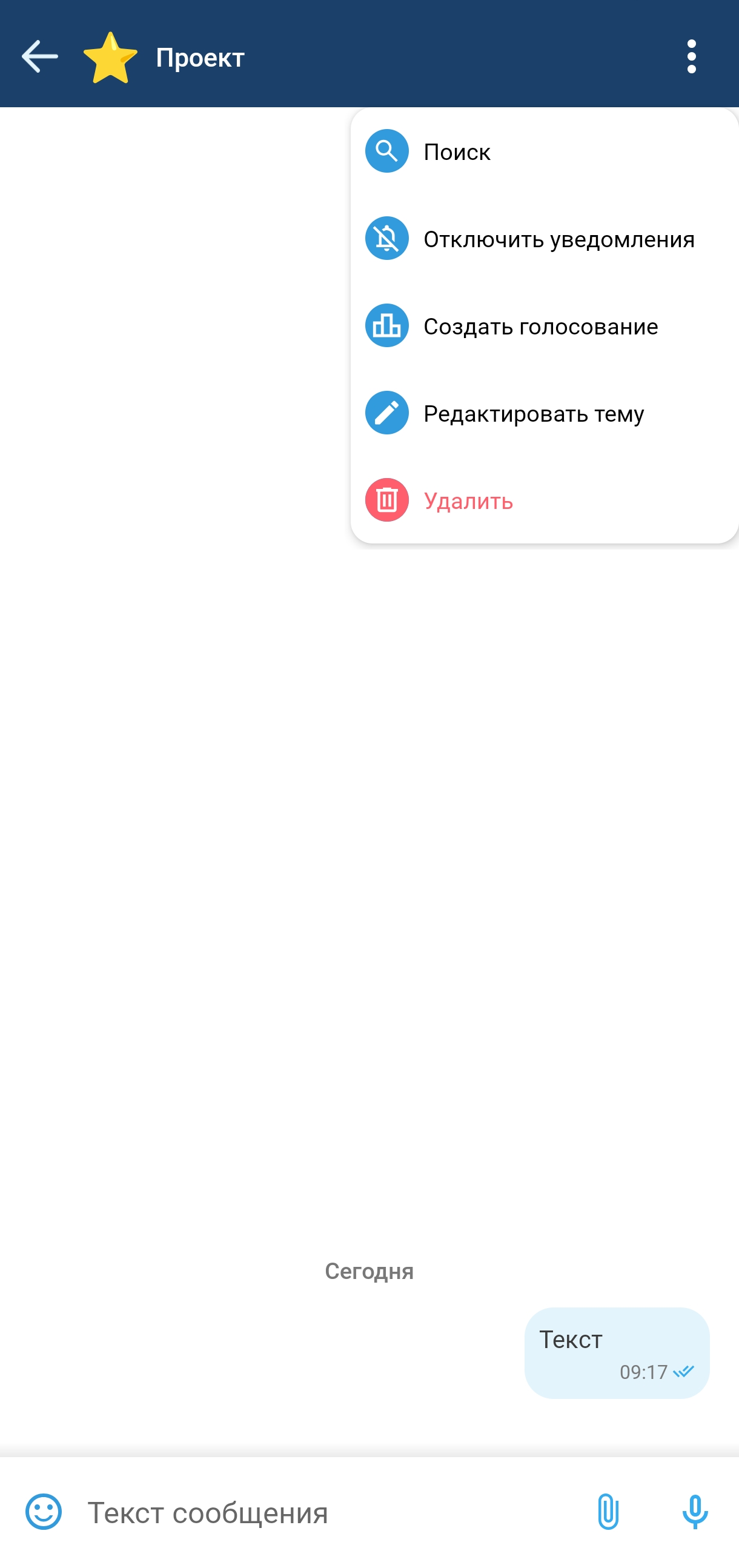 Создание темы доступно из выпадающего меню на интерфейсе списка тем и из интерфейса информации о чате (см. раздел «Интерфейс информации о чате»).
