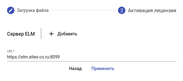Нажмите кнопку "Далее". Откроется второй шаг маcтера активации лицензии. В поле "URL" введите URL подключения к серверу лицензий в формате "https://<Адрес ELM-сервера>:<Порт ELM-сервера>":