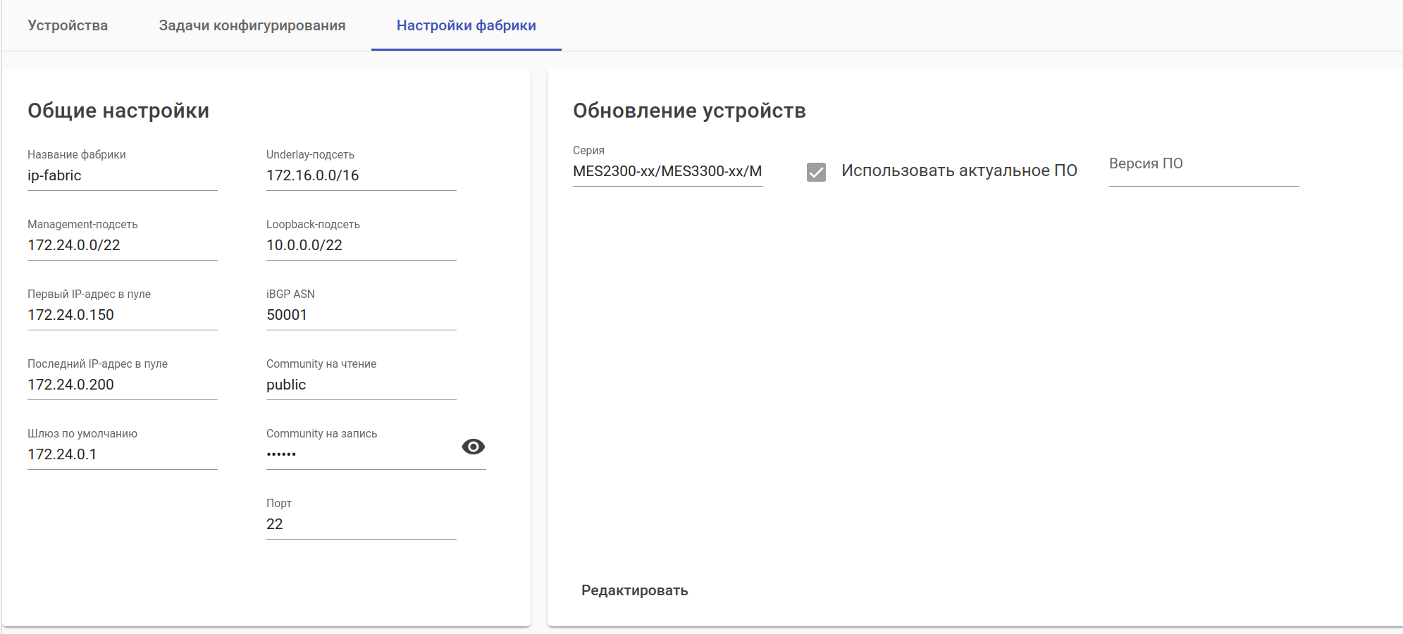 Раздел предназначен для мониторинга и конфигурирования устройств, добавленных в IP-фабрику.