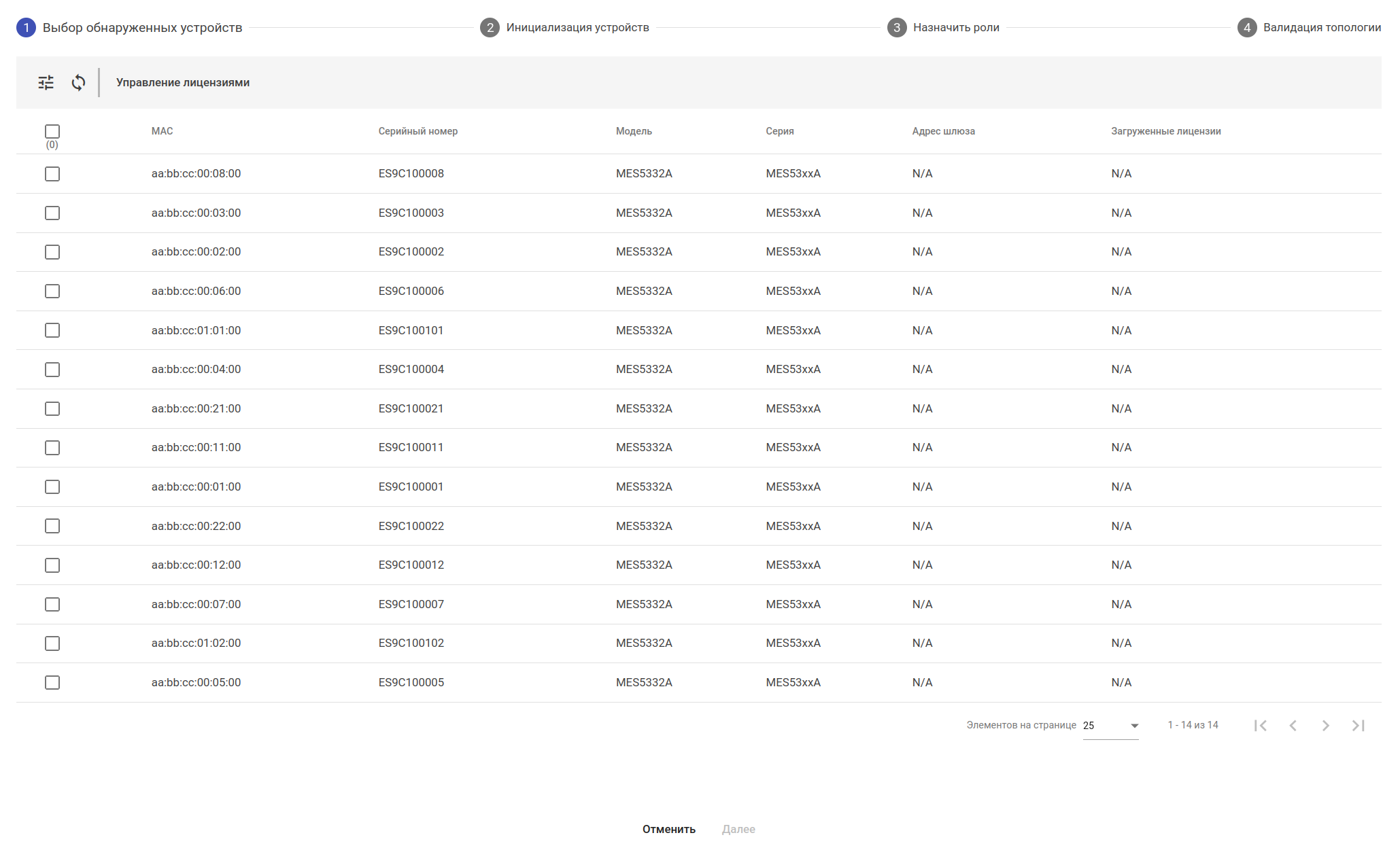 На данном шаге необходимо распределить роли, в соответствии с которыми будет подготовлена и применена конфигурация на устройства. Для этого пользователю предоставляется список устройств, прошедших инициализацию и инструменты для назначения роли каждому устройству.