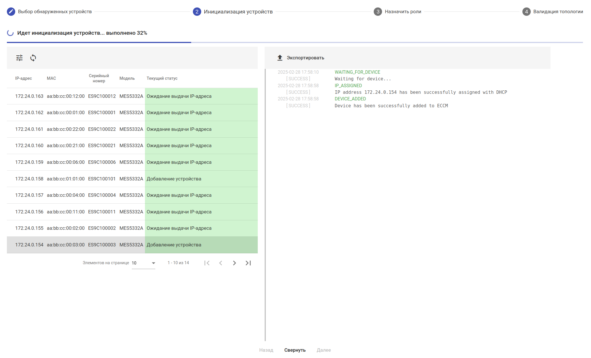 2. Таблица устройств — содержит поля: IP-адрес, MAC, серийный номер, модель и текущий статус инициализации устройств. Если устройство находится в процессе выполнения одного из шагов инициализации, то статус отмечается зеленым цветом. Если произошла ошибка — красным. При выборе устройства справа от его названия отобразится более подробный лог процесса инициализации;