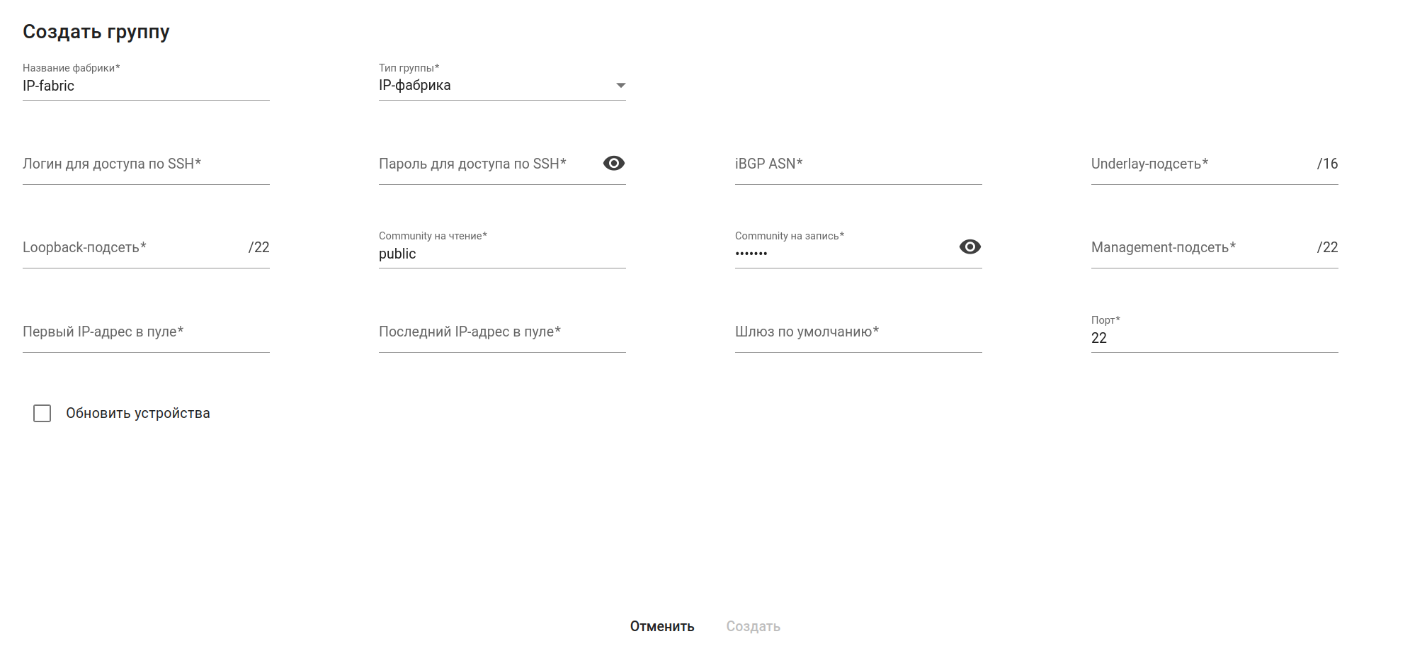 В диалоговом окне "Создать группу" выберите тип "IP-фабрика": в окне отобразятся дополнительные параметры для IP-фабрики: