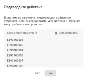 Предупреждение содержит список серийных номеров устройств, для которых необходимы лицензии. Список можно сохранить в файл формата .csv (открывается любым текстовым редактором или Excel) с помощью кнопки "Экспортировать". Если подтвердить действие ("Да"), начнется процесс инициализации, а лицензии можно будет загрузить позже вручную. Если отменить действие ("Нет"), можно будет перейти в раздел управления лицензиями и загрузить необходимые файлы, а затем снова начать инициализацию. В этом случае лицензии будут загружены автоматически.