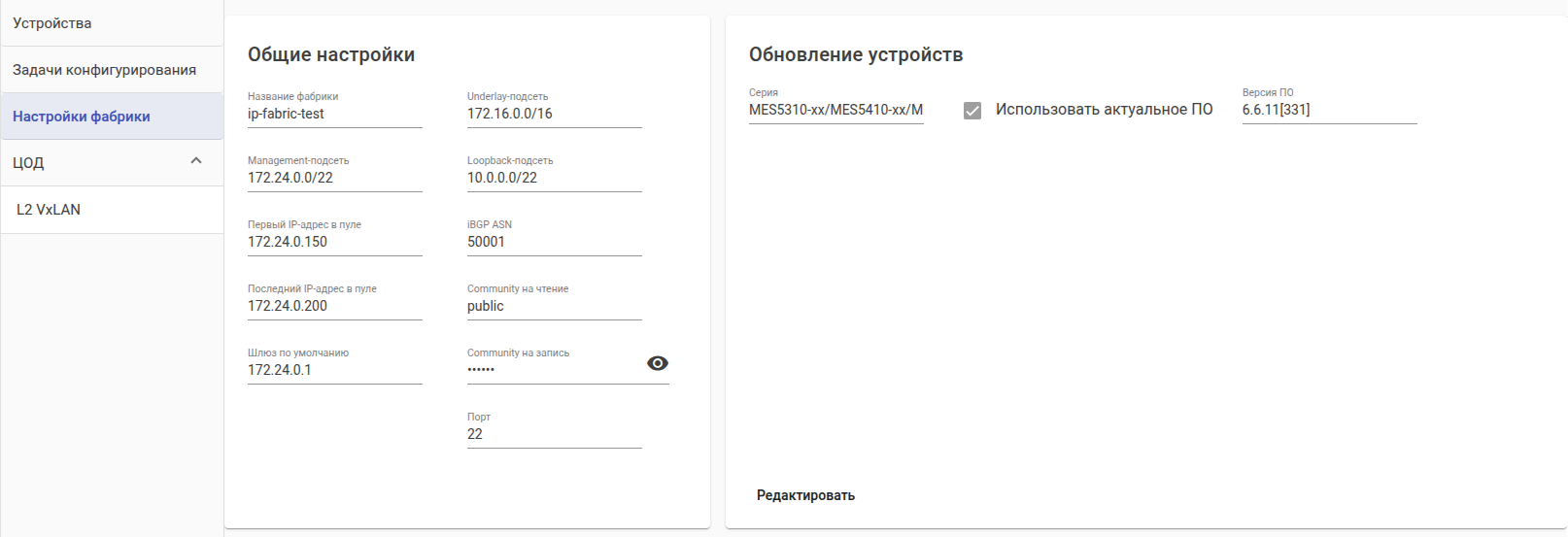 2. Функции управления устройствами для конфигурирования, сравнения конфигураций, обновления ПО и блокировки/разблокировки. Функционал аналогичен тому, что используется для устройств вне фабрики, за исключением операции "Обновить конфигурацию IP-фабрики", данная операция позволяет принудительно обновить конфигурацию устройств IP-фабрики с назначенными ролями;