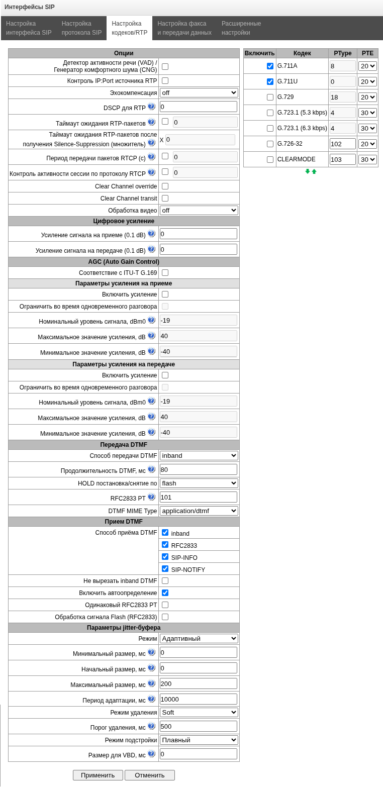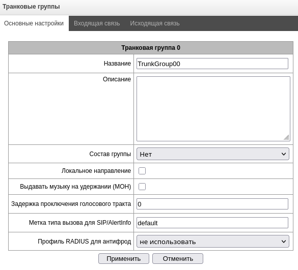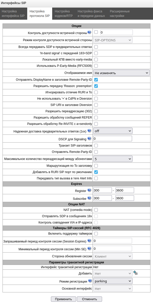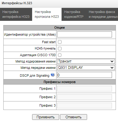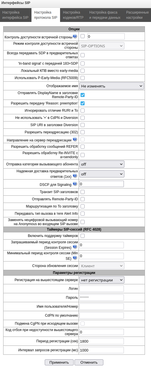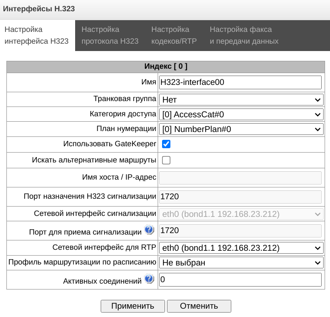 - Управление VoIP (интерфейсы SIP, интерфейсы H323) – предоставляется возможность настройки интерфейсов SIP и H323;