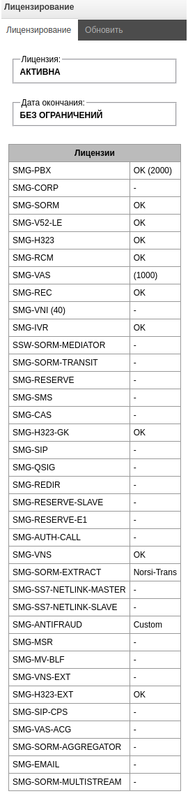 - SMG-RESERVE-SLAVE – активация резервирования по IP в режиме master-slave (общее время работы устройства без шлюза с лицензией SMG-RESERVE составляет 720 часов);