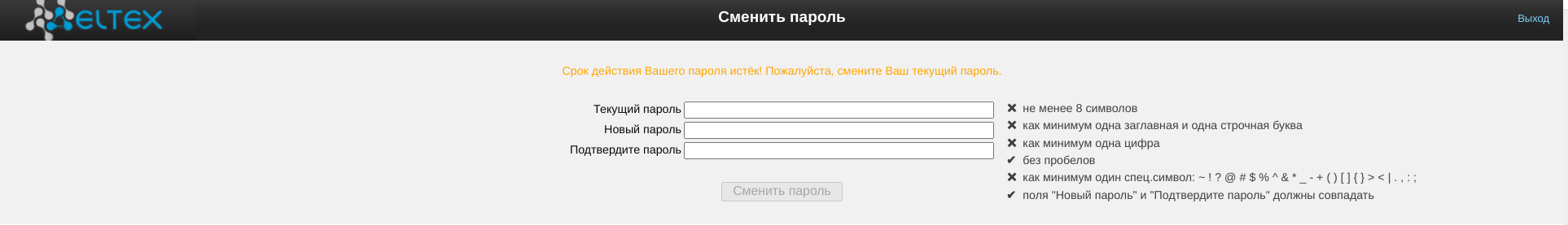 После авторизации с паролем по умолчанию система потребует придумать и ввести новый пароль, соответствующий критериям надёжности, указанным справа от полей ввода. Проверка надёжности происходит автоматически, соответствия требованиям помечаются , несоответствия – .