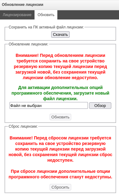 С помощью кнопки «Обзор» следует указать путь к файлу лицензии, полученному от производителя, и произвести обновление, нажав «Обновить».