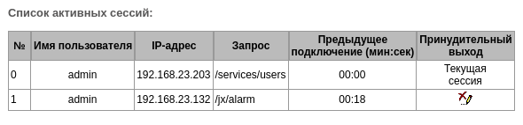 В данном блоке отображается список пользователей, которые в данный момент подключены к веб-интерфейсу SMG. Для администратора есть возможность принудительно завершить сессию других пользователей, для этого необходимо нажать кнопку «Принудительный выход» в строке с пользователем сессию которого необходимо завершить.