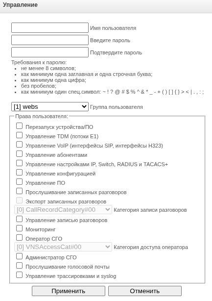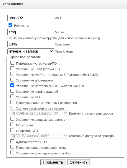 - Имя – имя группы пользователя для входа в web-конфигуратор;