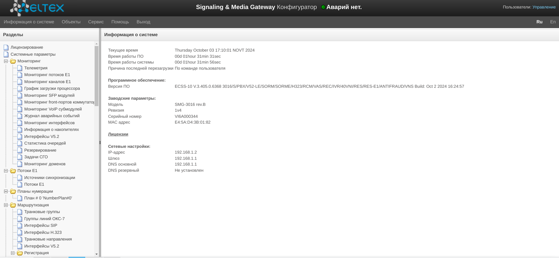 Подробная информация о системе (заводские параметры, версия SIP-адаптера, текущая дата и время, время в работе, сетевые настройки, температура внутри корпуса) доступна по нажатию на ссылку «Домой» на панели управления.