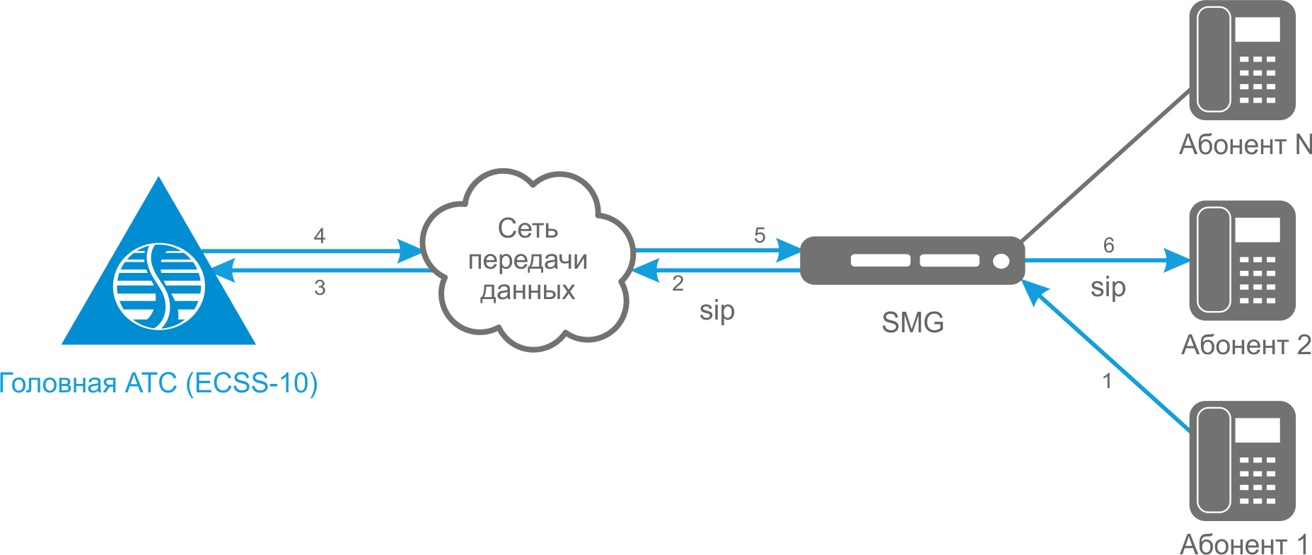 Потребуется создать на SMG транковый SIP-интерфейс в сторону головной АТС и настроить интерфейс для регистрации абонентов таким образом, чтобы он использовал sip-транк в сторону ECSS-10 в качестве интерфейса upper-регистрации.