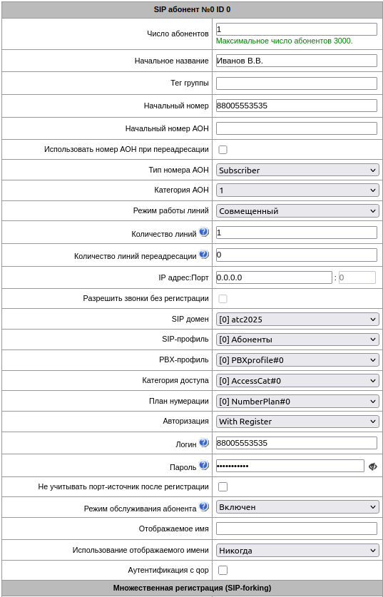 • Перейти в настройки SIP абонентов (раздел Абоненты — SIP абоненты);